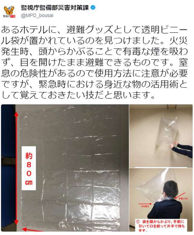 ▼透明塑膠袋也非常強大,火災時,最危險的就是吸入濃煙,或逃難時被燻到無法張開眼睛,但套上之後就可以有效避免這些狀況。當然也得注意別勒得過緊,造成窒息!