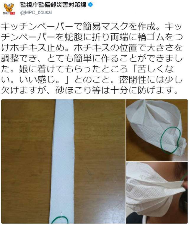 ▼廚房紙巾則能做成簡易口罩,紙巾兩端用釘書機固定橡皮筋,再稍微拉開,就是一個口罩了!連女兒試戴時也表示不會難以呼吸,感覺很不錯。雖然密閉性稍微差一點,但也是危難時的應急對策了!