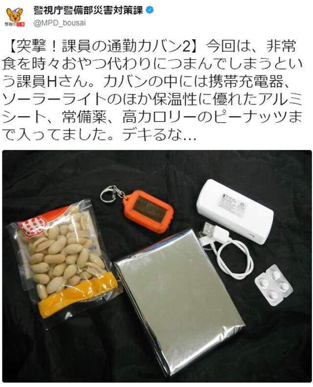 ▼2號職員包包裡帶的是攜帶型充電器、太陽能手燈、保溫用的鋁箔墊、常備藥物、高熱量的花生。
