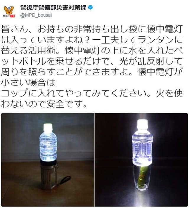 ▼隨身攜帶的小手電筒其實只要搭配水瓶,就能夠成為照亮整個空間的光源喔!把手電筒裝進杯內,至於水瓶下方,光的亂反射就會照亮四周了。