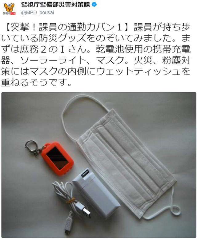 ▼防災課的課員也會隨身攜帶這些防災用品,課員1號帶的是乾電池手機充電器、太陽能手燈、口罩。為了避免火災或粉塵的侵害,口罩內部還會放濕紙巾。