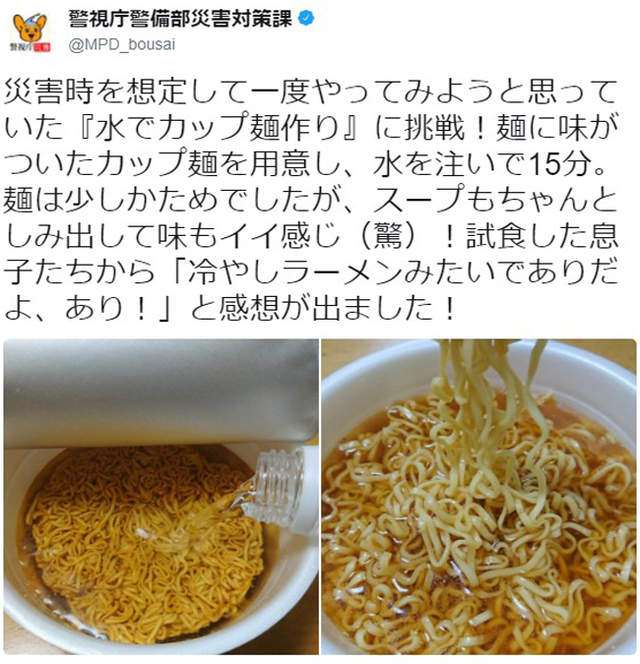 ▼災難沒有糧食的時候,其實冷水也是可以拿來泡麵的!在注入水15分鐘後,麵就會稍微軟化,湯也會有味道。試吃的兒子們表示,味道很像冷拉麵!