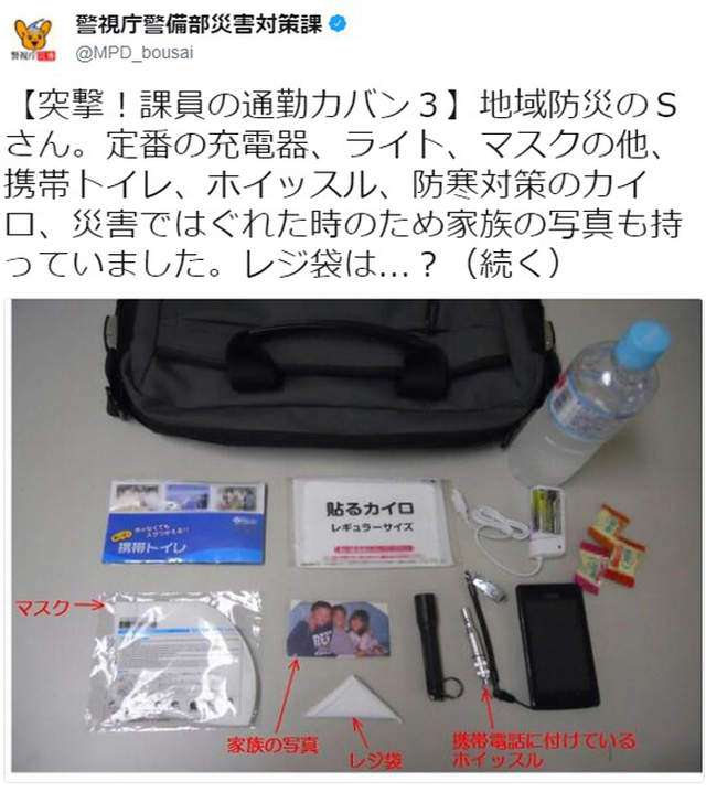 ▼3號職員則一樣是充電器、小燈、口罩、隨身廁所、口哨、暖暖包、家族合照,以及…塑膠袋?