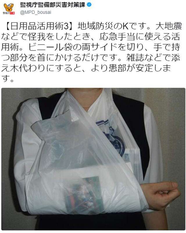 ▼事實上塑膠袋真的是防災神器,急用時可以切開塑膠袋的兩側,塑膠袋手把部分交錯在脖頸,中間的雜誌就當固定的支架,這樣患部就可以穩定了。