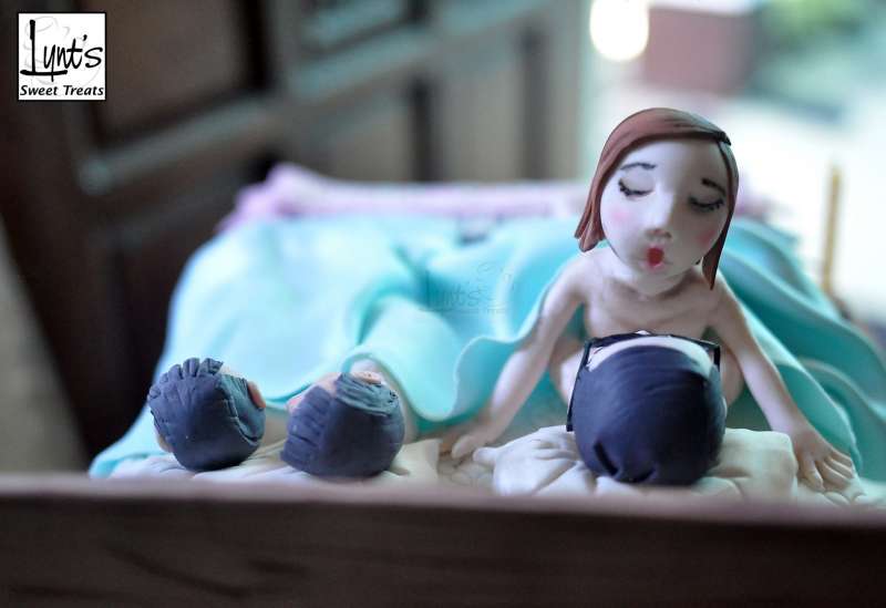 ▼這個蛋糕做得相當細緻,不只棉被的皺紋、脫掉的內衣褲還有床單的花紋都刻畫得維妙維肖,尤其是爸爸的表情,看起來像是怕身旁熟睡的孩子醒來,但又想享受這短暫的美好,相反媽媽則是完全沉浸其中,絲毫不緊張,這個作品令人看了非常有共鳴,不管是夫妻,還是小孩!