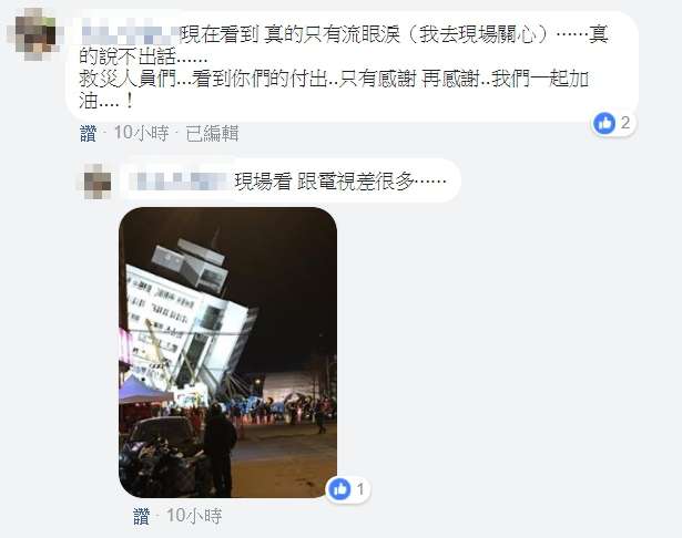 ▼此文一出,網友紛紛致上感謝,「謝謝你們默默的付出」、「不管是搜救人員、施工人員、運送物資人員等等,很感謝你們大家無私的奉獻,辛苦你們在這麼寒冷天氣,及不穩定的情況下完成任務」、「謝謝所有工作人員不眠不休的搶救」、「現在看到,真的只有流眼淚(我去現場關心)…真的說不出話」、「世上最帥氣的背影!加油」。