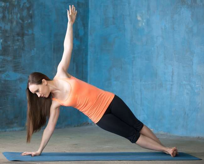 ▼側平板式:先採用下犬式,雙腳併攏,身體轉向右側。肩膀向後轉,將左手抬起來,朝向天花板。保持這一姿勢15到30秒,然後回到下犬式,轉向另一側。