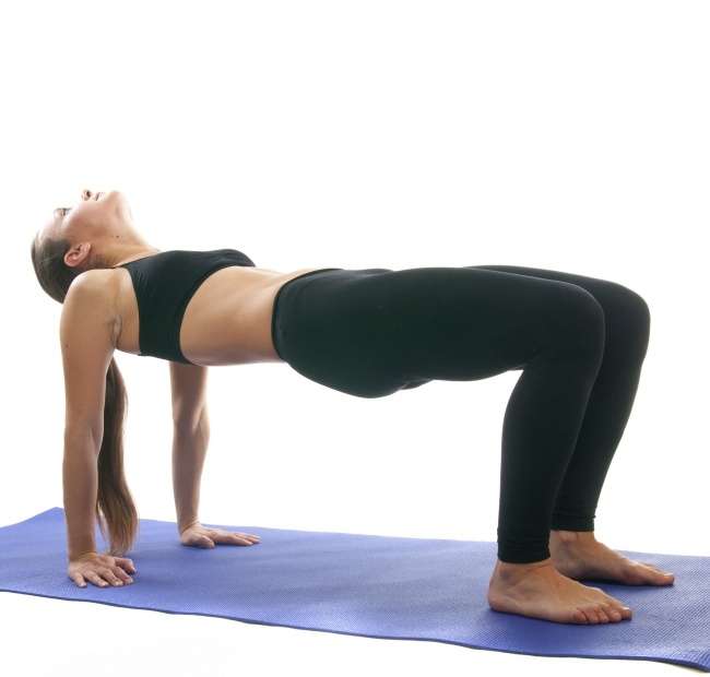 ▼桌式:坐姿雙腿前伸,雙手置臀部兩側手指朝向腳部。以腳為著力點,雙腿夾緊準備抬起身體。從尾椎骨部位提高身體,試著將頭向後仰。雙腿彎曲,使身體看起來像張四腳桌子。保持30秒。