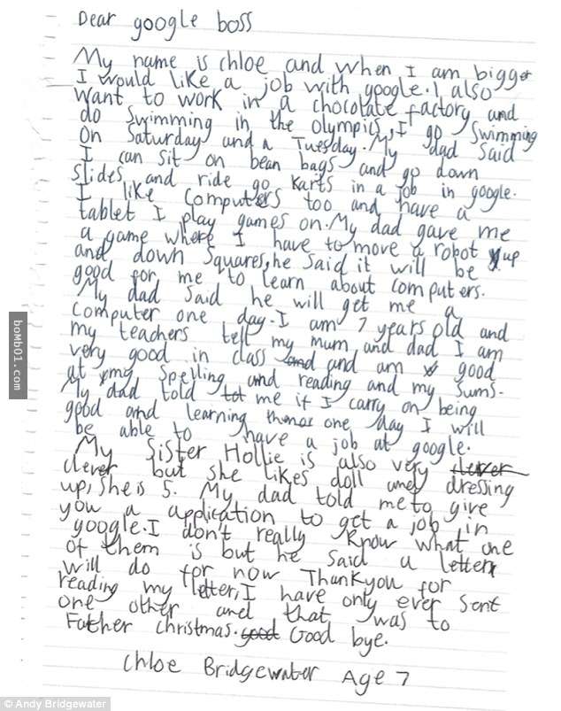 「親愛的Google老闆,我的名字是克洛伊,等我長大之後,我希望自己有機會在Google工作。