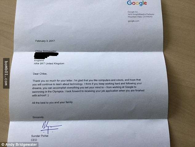 ▼對於桑德爾的親自回信,克洛伊和爸爸安德魯(Andrew)都非常驚喜,這名感動的爸爸還把兩封信都分享到網路上,表示克洛伊其實在幾年前遭遇車禍後,就變得對自己很沒有自信。但是自從收到桑德爾執行長的回信後,她整個人超開心的,現在更希望自己以後一定要到Google工作了!