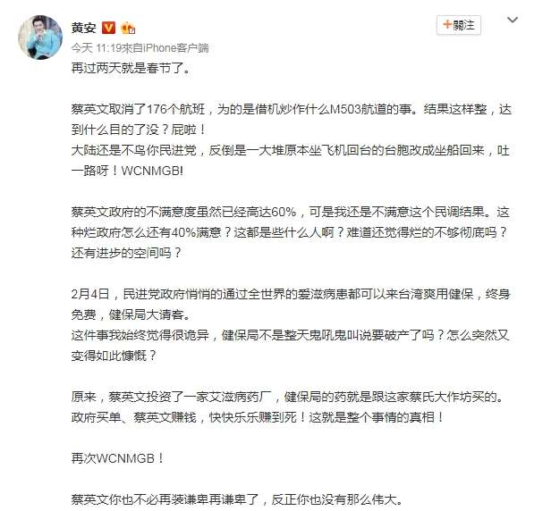 ▼以下是黃安在微博所發的全文,開頭還順便酸了一下民進黨取消了176個航班的政策: