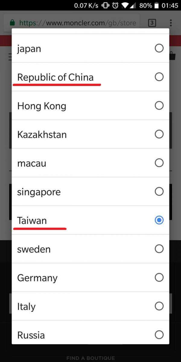 ▼這一次中國官媒《環球時報》記者在Moncler的英文官網發現了這件事,原來在查看全球分店的頁面,不僅在「選擇國家」時分別將台灣、香港和澳門分別單獨列出,還將中國(中華人民共和國,People's Republic of China)的英文寫成了大家熟悉的「Republic of China」。