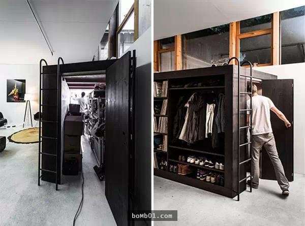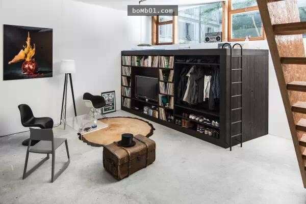▼利用電視櫃的空間加以設計,這台電視櫃的上方有令人驚嘆,書櫃、衣櫃、鞋櫃、床等…打開梯子旁邊的暗門,裡面可以當作儲藏室或者工具間。