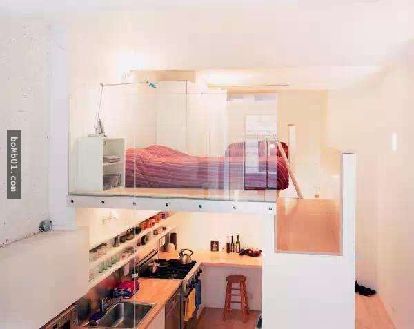 ▼現代廚房在上方上方構建一張床,提高所有可用空間,就算住在像鳥巢一樣的房子也不需要害怕沒空間可以用。