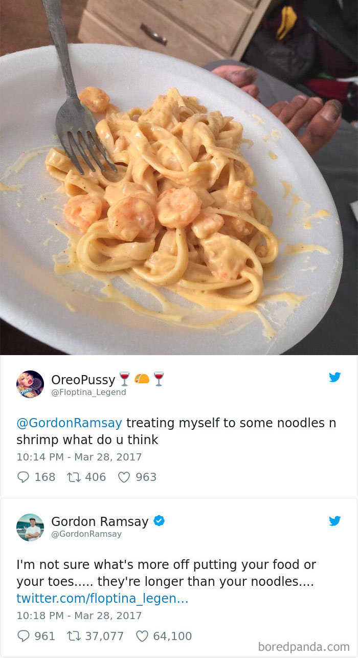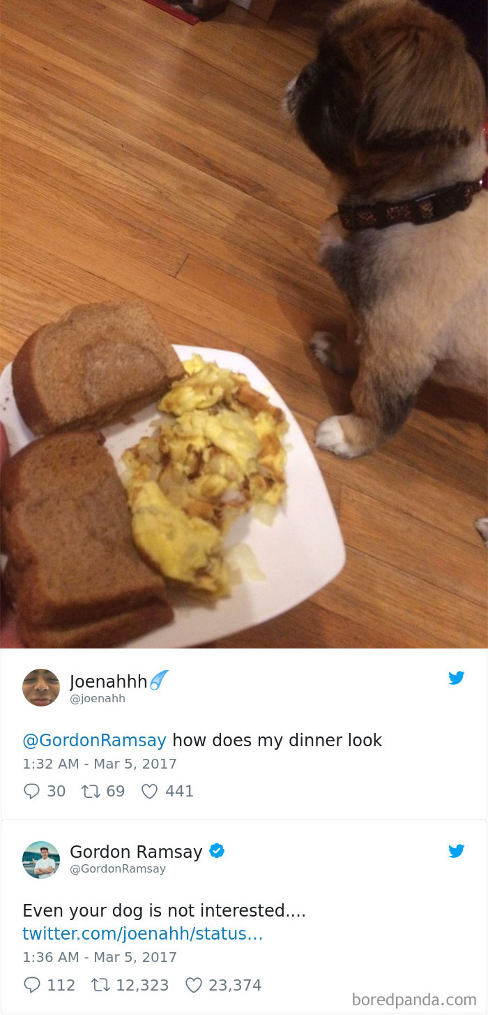 2018年02月18日米其林名廚戈登·拉姆齊 (Gordon Ramsay)憑藉毒舌的風格深受喜愛。看他在節目中將別人的料理批評得一無是處,感覺超級爽,如果這種毒舌對準的是自己,結果就不一樣了。下面這些網友就請「地獄廚神」戈登·拉姆齊為自己做的料理評分,看到回覆後都要留下心理陰影了。