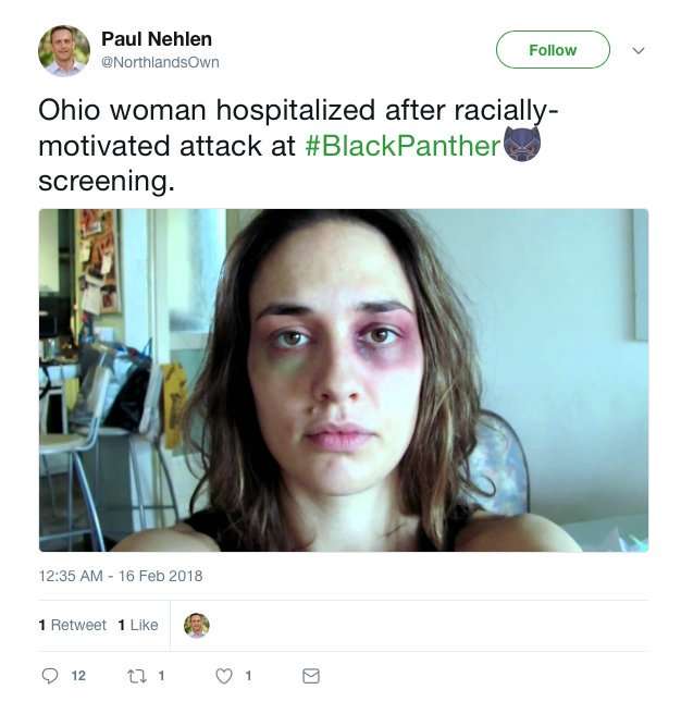▼「我和女友去看《黑豹》的時候,一群年輕黑人說,這部電影不是給我看的,因為我是白人,然後他們就攻擊了我。」後來經證實,這些消息都是偽造的。照片中的女生是白宮幕僚秘書Rob Porter的前妻。