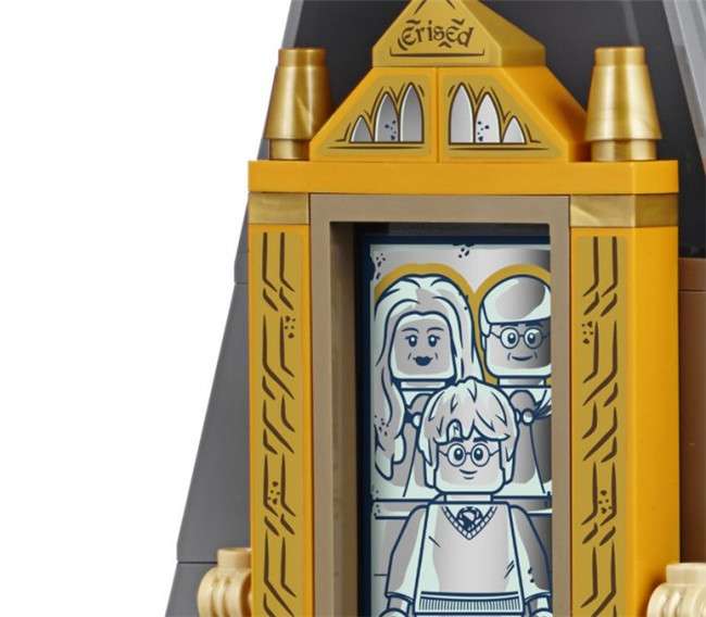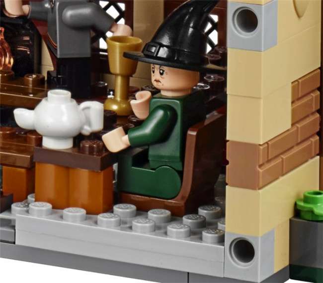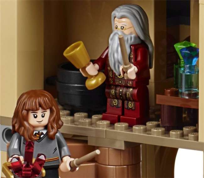 ▼這套積木描繪的是哈利波特剛到霍格華茲魔法學校學習的場景,整座建築一共四層高,尺寸為37cm高、17cm寬、30cm深,零件包括壁爐、長凳、桌子、分院帽、掃帚、魔杖、蠟燭、獎杯、食物等電影里出現的各種道具,還有一個寶藏和魔藥課教室,最特別的是有一個螺旋樓梯的塔樓,可以通往意若思鏡(the Mirror of Erised)。