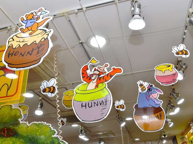 ▼在店裡抬頭往上看,可以看到許多可愛的吊牌裝飾品,都是維尼最愛的蜂蜜罐!