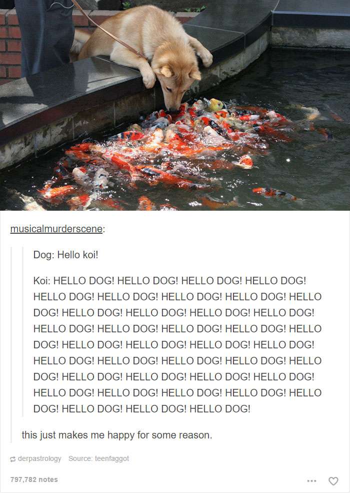▼狗狗:「Hi,魚魚們!」錦鯉:「Hi,狗狗!」「Hi,狗狗!」「Hi,狗狗!」「Hi,狗狗!」「Hi,狗狗!」「Hi,狗狗!」「Hi,狗狗!」「Hi,狗狗!」「Hi,狗狗!」「Hi,狗狗!」……