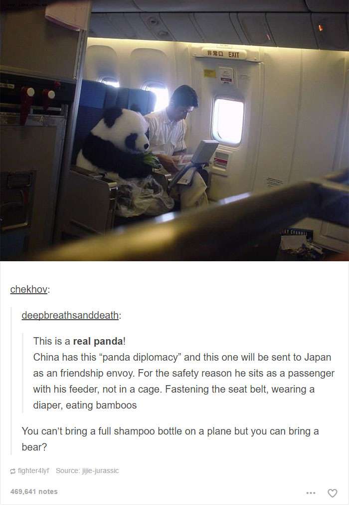 ▼「這是真正的熊貓!中國有一隻『外交熊貓』,牠正飛往日本擔任友好使者。為了安全起見,牠和監護人一起坐在椅子上,沒有關進籠子裡。牠乖乖繫著安全帶,穿著尿布,吃著竹子。」「連洗髮精都不能帶上飛機,卻能帶一隻熊?!」