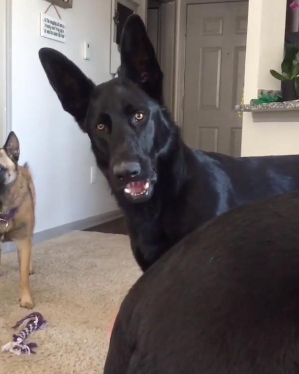 ▼其他網友也大笑說:「黑狗問號?」、「德國牧羊犬真的好聰明」、「牠整個注意力都放在哭泣的小女孩身上」、「牠嘴裡是不是有兩顆球?」、「旁邊的同伴也一起呆住,好好笑~」