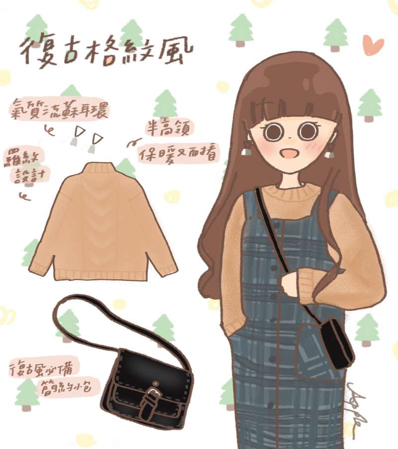 ▼最近超流行的復古風也是很搶眼的裝扮。一件背心格子裙搭配半高領毛衣,還有復古斜挎小包,舒適又輕鬆的一身超讚的。