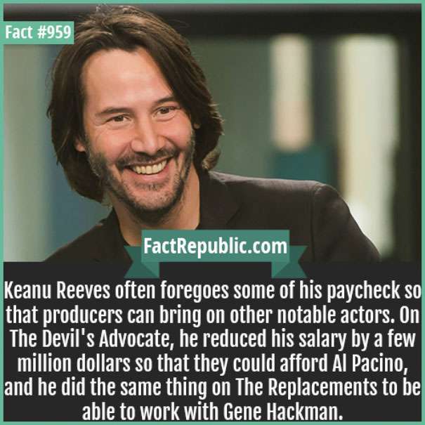 ▼為了與合適的演員合作,基努李維寧願自砍片酬。拍攝《魔鬼代言人》時,他自砍幾百萬美元,讓制片公司能夠請到艾爾帕西諾;拍《十全大補男》時也一樣,最後他能夠與金哈克曼合作。