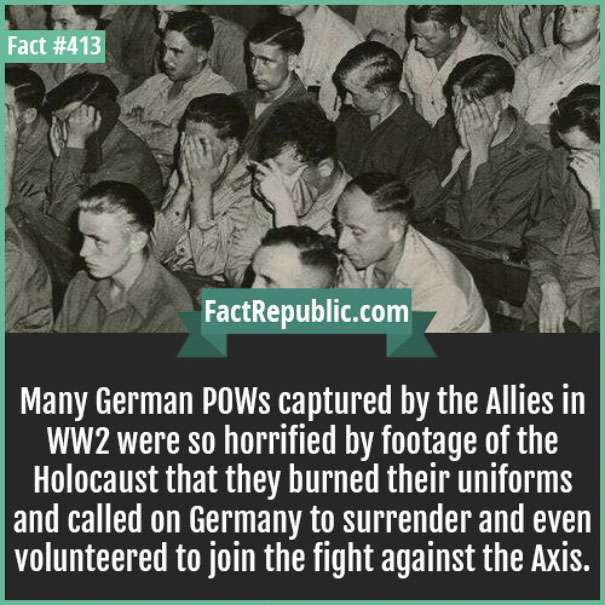 ▼二戰期間,許多被同盟國帶回的德國戰俘被猶太大屠殺的影片震撼,他們很慚愧,燒掉了自己的制服,並呼籲德國投降,甚至自願加入同盟國軍隊來對抗軸心國。