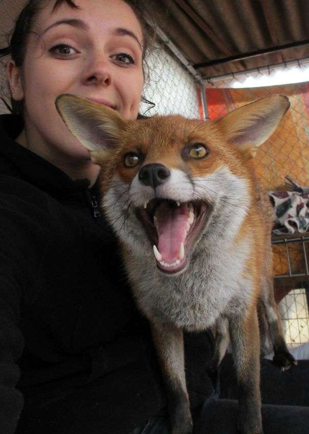 ▼「這隻狐狸超愛野生動物保護區的工作人員。」