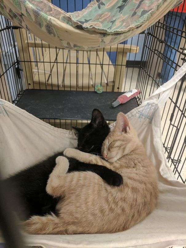 ▼動物救援中心的志工和貓咪一起睡覺。
