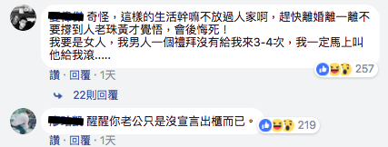 ▼網友看了都為妻子抱屈,認為:「這樣的生活幹嘛不放過人家啊,趕快離婚離一離不要撐到人老珠黃才覺悟,會後悔死!」