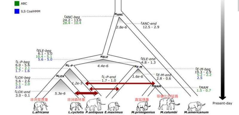 ▼只要看這張圖表,就能更加了解。紅色箭頭表示兩物種有交配行為,「真猛瑪象」和「哥倫比亞猛瑪」跟森林象曾有曖昧情!