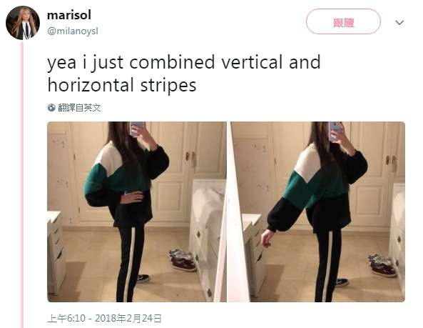 ▼原來照片中Marisol的另一隻腳在後面,可是因為運動長褲的白色部分,看起來就像是雙腿中間的縫隙,才會產生了這種有趣的視覺錯誤。