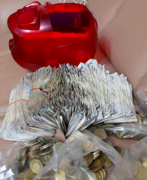 ▼新竹縣一名輕熟女有良好的儲蓄習慣,她有ㄧ個可愛的紅色小豬撲滿,每次出外聚餐購物回家後,總會用餵小豬一些錢。她和一般人不同的地方,在於她不會丟一元或五元等硬幣,而是直接塞500元鈔票,偶而也餵些50元硬幣。