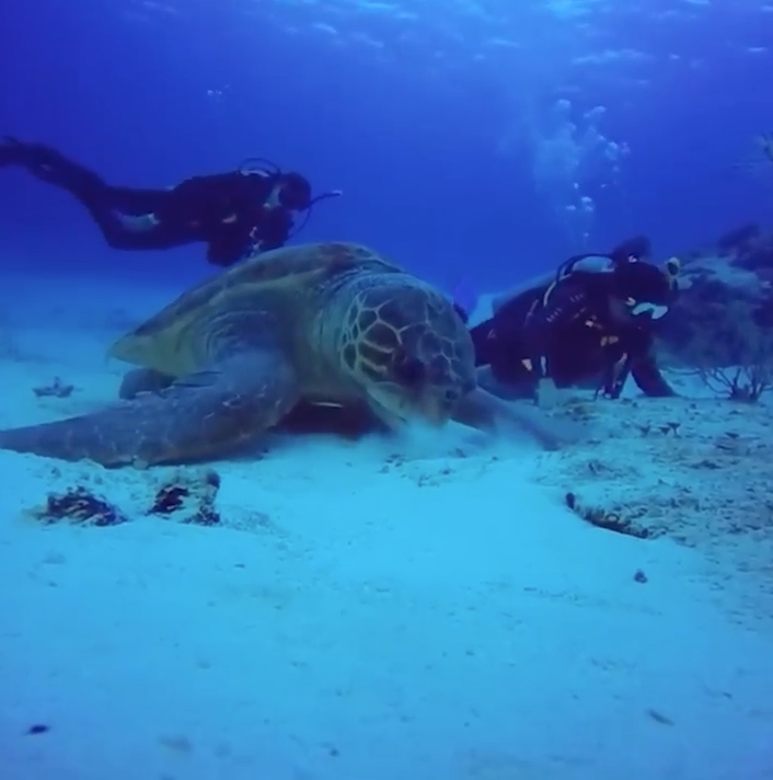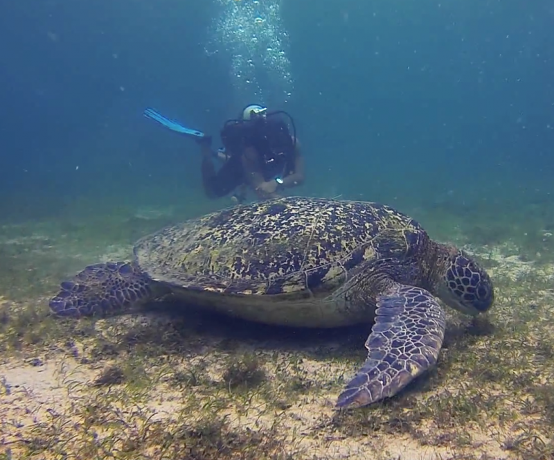 ▼影片中這隻身形龐大的比潛水伕還長,目測身長超過2公尺,可能重達800多公斤,當牠看到比自己的弱小的人類,完全不害怕和警戒,仍然鎮定自若的吃著海草。