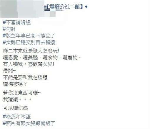 2018年03月05日臉書社團「爆廢公社二館」一向都主打自拍照、美食、寵物、直播、po廢文等行為,不過有網友在上面分享女兒照片卻被酸民攻擊,讓她忍不住發文反擊表示:「若你沒東西曬,我建議…可以曬你娘」。