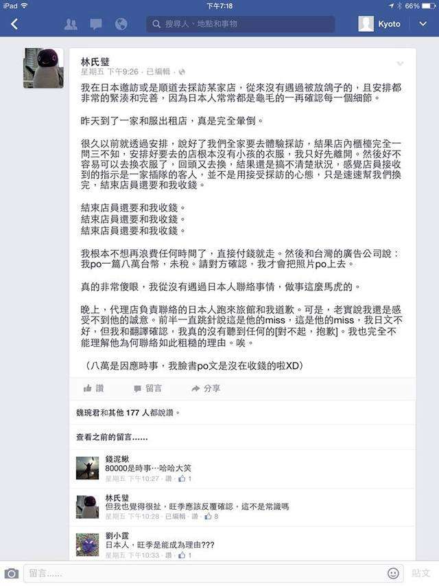 ▼事實上,林氏璧在過去就曾自爆一篇業配價碼是8萬,並抱怨日本和服店找他合作,結果竟然要收錢。粉絲團《癮日本》因此嘲諷道:「原來部落客在日本吃喝玩樂都是免費(一要付錢就哇哇叫)的!」還批部落客跟「文化流氓」沒兩樣。