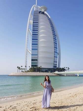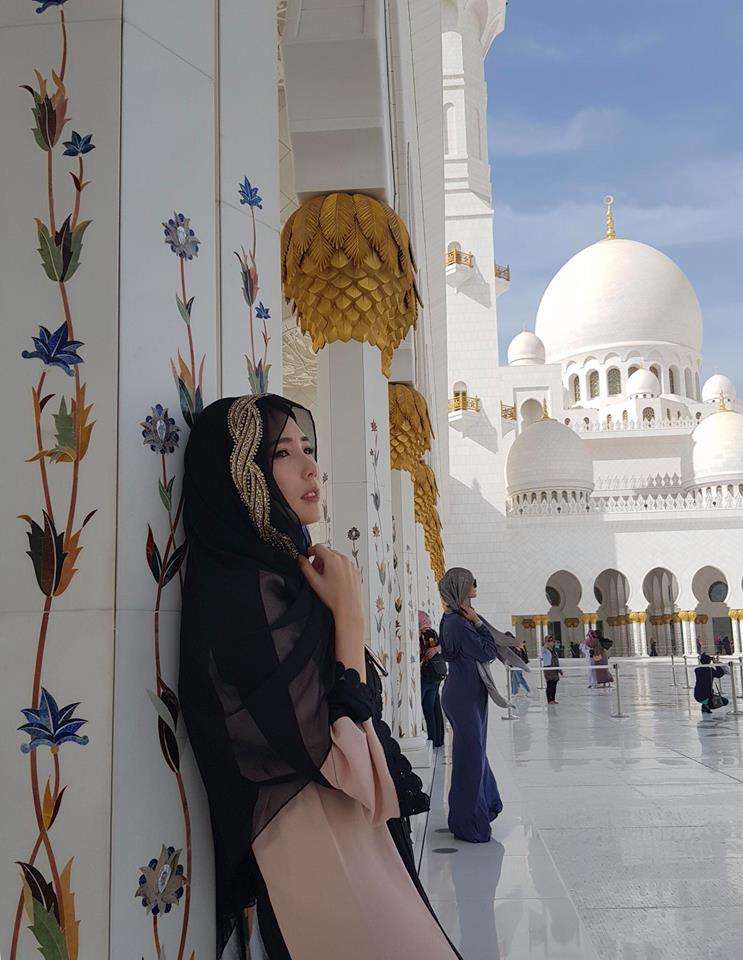 朱琦郁在臉書上也分享了杜拜旅遊經驗,她站在大清真寺前拍下美照,並提醒大家到清真寺應有的穿衣禮儀:「男生服裝上倒是沒什麼要求,不要穿短褲就好,女生最好在台灣就準備過手肘和過腳踝不透光的寬鬆服裝(白色不行)。」