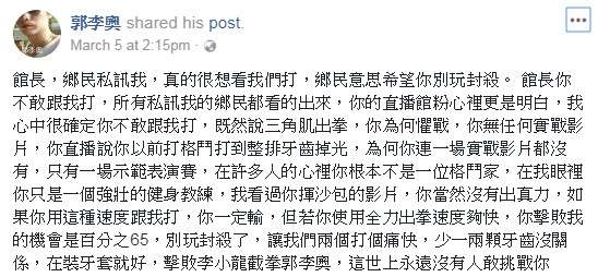 ▼如今已經關閉臉書的「郭李奧」,近日在臉書連續發文狂嗆館長,還自稱是「截拳道武術館負責人」,一直要跟館長約戰。