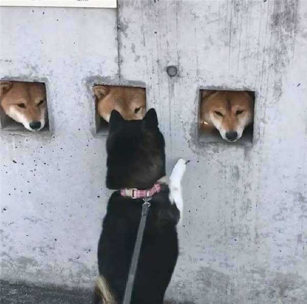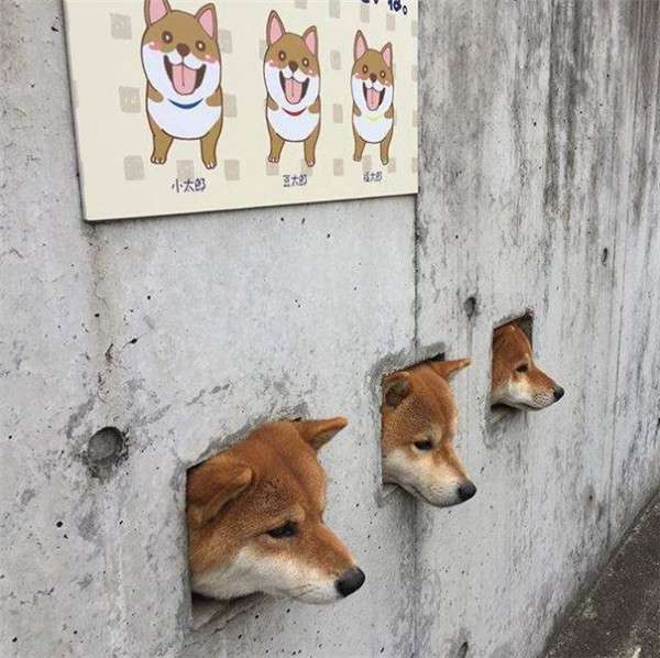 ▼誰知這三隻調皮的柴柴不滿足於透過小孔看外面,而是喜歡把頭伸出來,但是小洞比牠們的頭大不了多少,只能剛剛好卡住,而且三隻喜歡同步做這件事情,所以路人就看到了這個滑稽的場景。