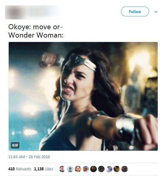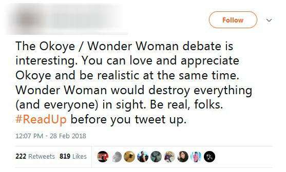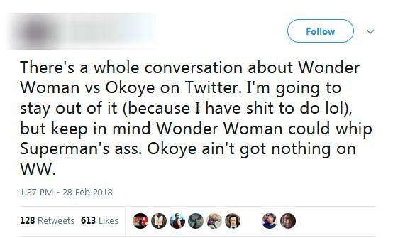 ▼「Okoye vs WW的討論很有趣,但崇拜Okoye時要實際一點,神力女超人可以摧毀她視線中所有的東西。」