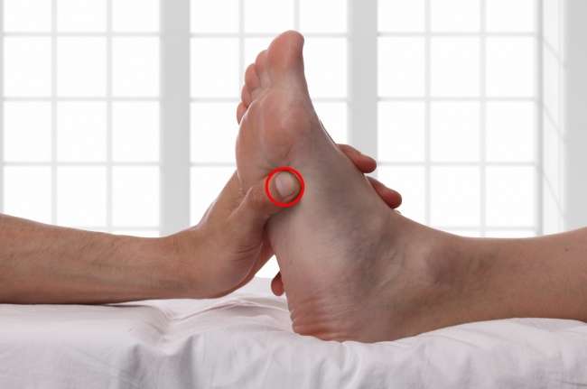 ▼湧泉:位於第二和第三腳趾之間。按摩這個穴位能夠治療頭痛、噁心、昏厥。