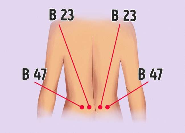 ▼腎俞、魂門:位於腰部第二腰椎棘突下旁開1.5寸處。按摩這個穴位能夠緩解胃痛、腹痛、消化不良。