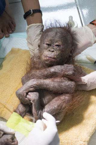 ▼救援人員騎機車經過9個小時把Gito帶到吉打邦猩猩康復中心,幫助牠恢復治療。救援人員猜測Gito原本是一隻寵物,牠被以30美元的價格賣給了別人。Gito因為遭受虐待而營養不良,肌肉萎縮,這讓他看上去像一個「木乃伊」。