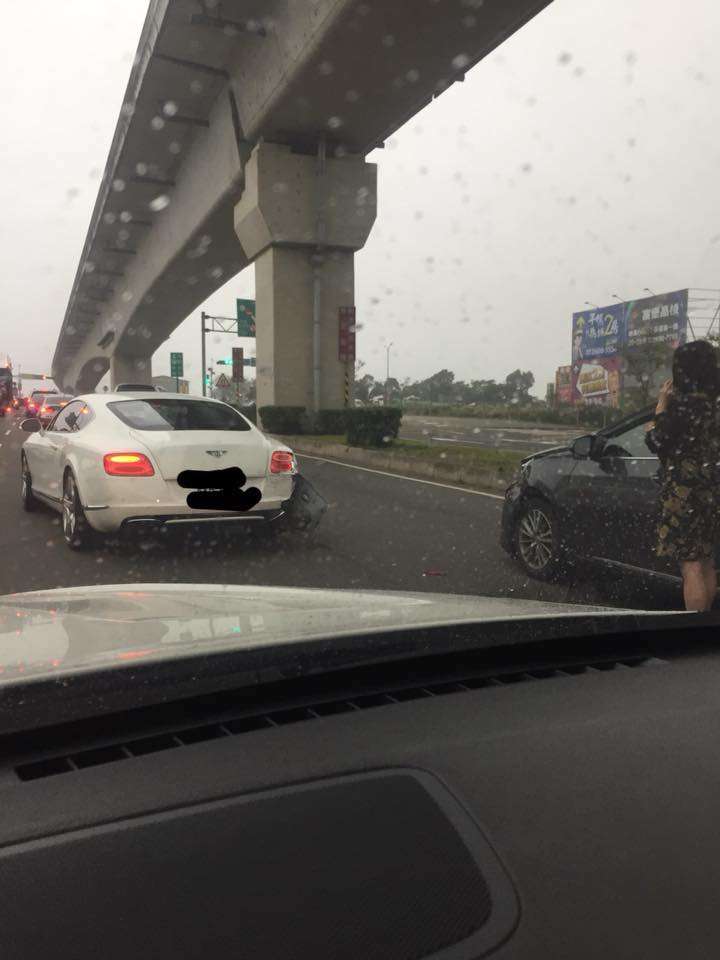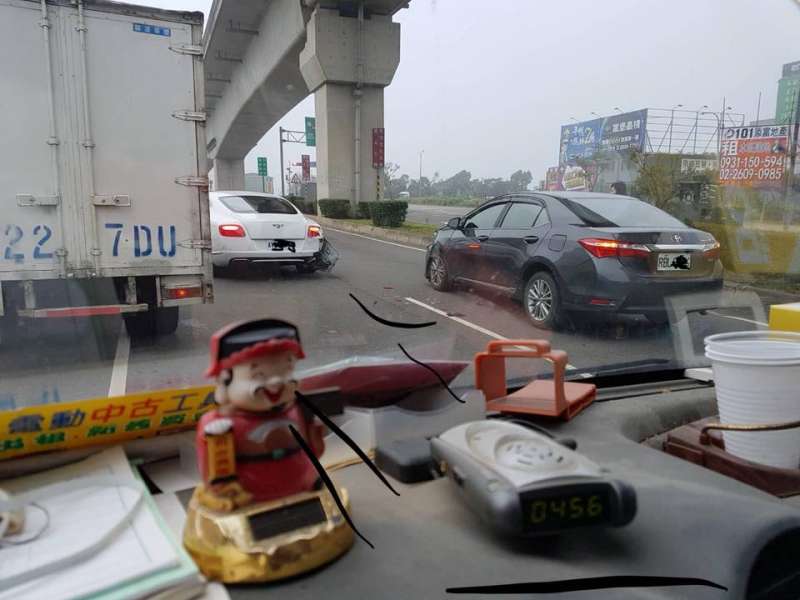 ▼警方介入調查後,了解事情原委。白色賓利車時速僅20-30公里,而黑色豐田汽車車速較快,約有50公里。當時白色賓利車想切換至左跑道,在左轉的同時,就被後方車輛撞到。