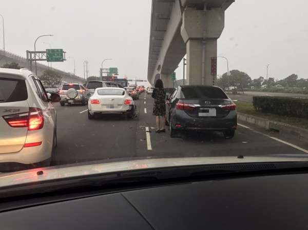 ▼3月5日,新北市林口交流道上發生交通事故,一名女駕駛撞到了前方白色賓利車,把對方的保險桿、葉子板撞凹掉落,而車燈和排氣管也有受損。身穿洋裝的女駕駛,一下車看到賓利車狀況,立刻嚇呆了,她站在大馬路上不知如何是好。