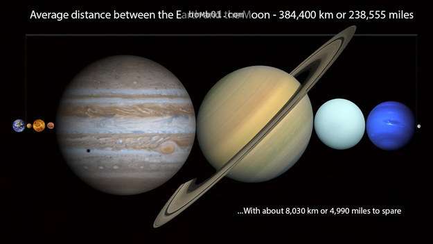 ▼18. 把太陽系裡的所有行星都「塞進」地球和月球中間的話,其實還會剩下大約8030公里的空隙,所以你可以想像地球和月球的距離是有多遙遠吧!