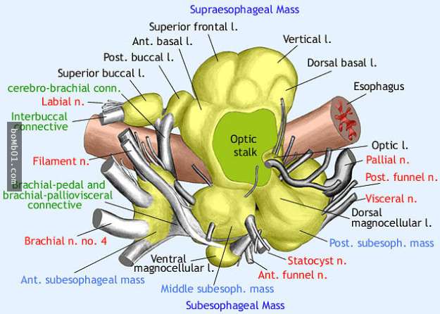 ▼15. 頭足綱軟體動物擁有最奇怪的腦部,像是墨魚的腦袋就長得像一個甜甜圈,然後食道還會從中間的洞孔穿越過去。