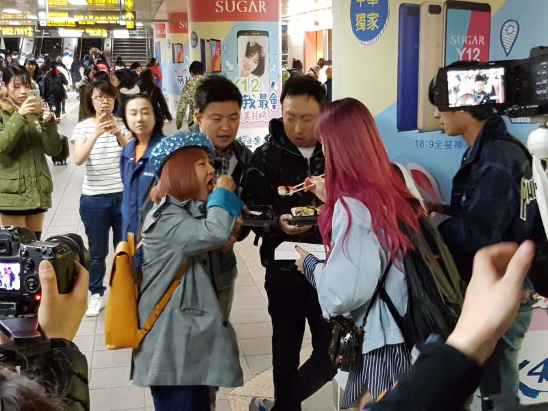 ▼原來他們抵達桃園機場之後變轉乘機場捷運抵達台北車站,開始了「窮遊」的行程。為了節省預算,他們還買了10元平價壽司來一起享用。