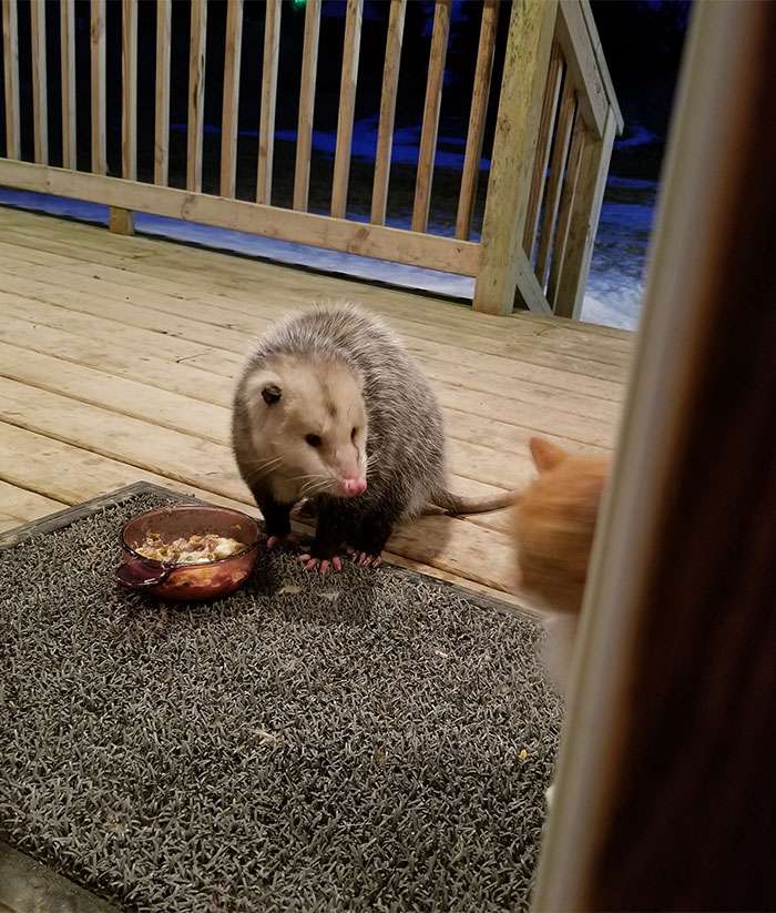2018年03月10日保護自己的食物是所有生物的本能,但很多毛小孩生活太安逸,已經忘了為食物拼命的感覺。日前,國外一名網友就在Imgur上分享了幾張照片。照片中,一隻負鼠跑到他家偷吃貓咪的食物,但貓咪的反應卻超讓人心都要融化掉。